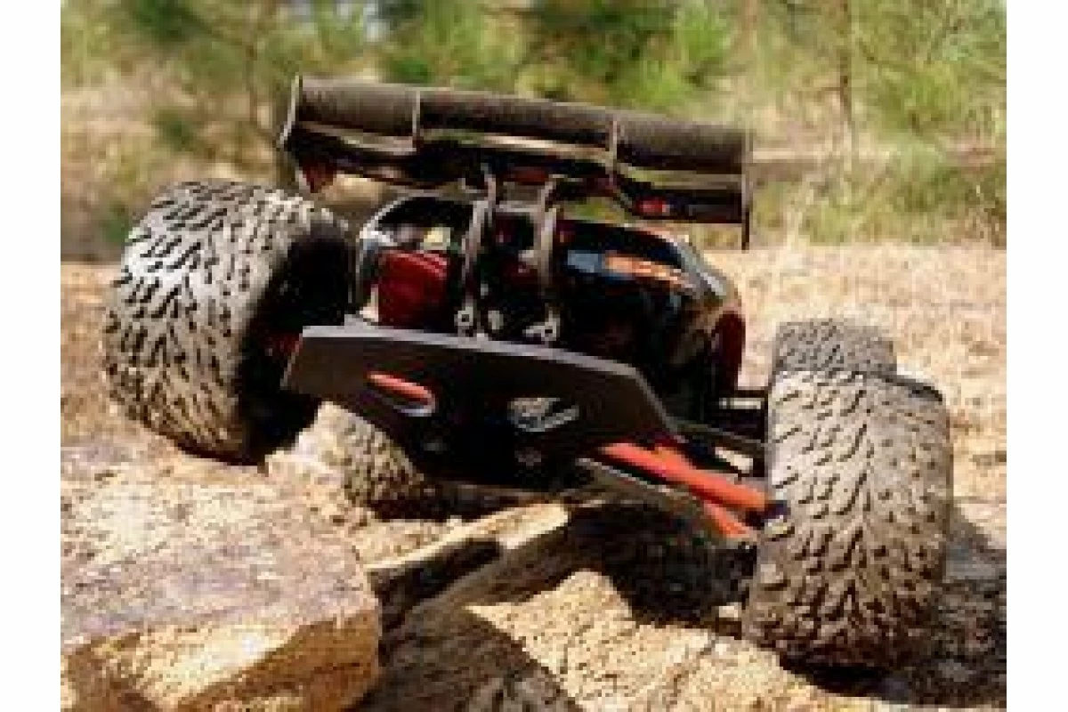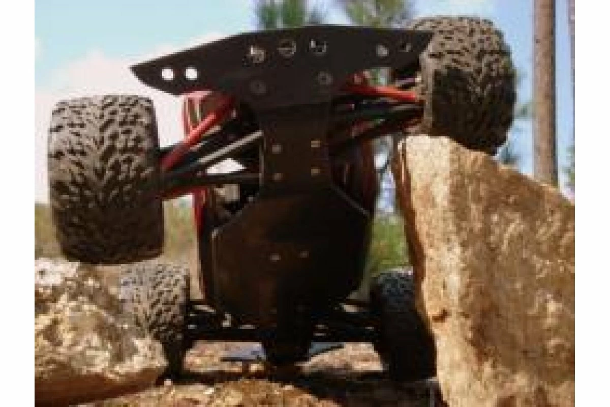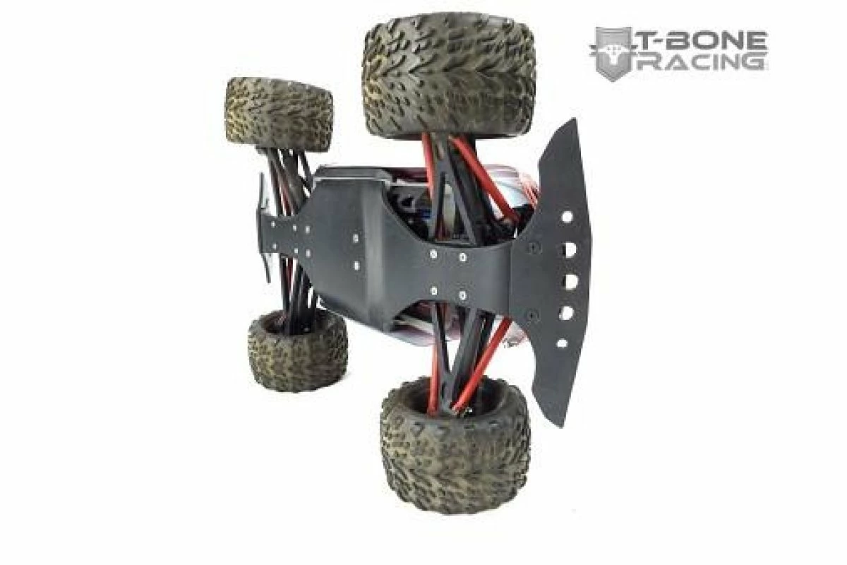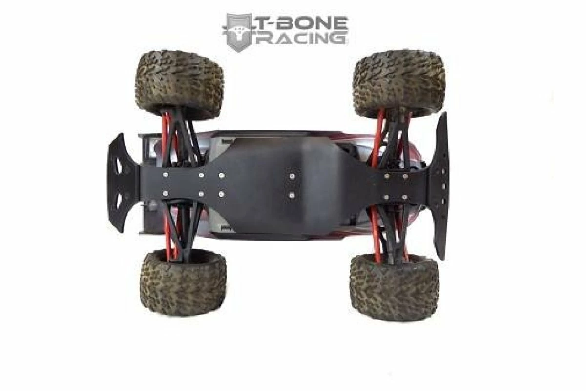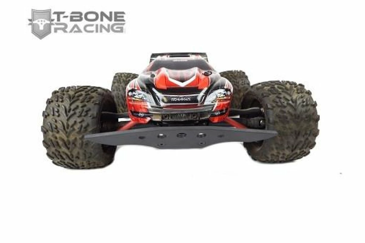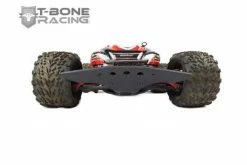 T-Bone Racing chassis brace for the 1/16 E-Revo is made of .125″ black nylon and weighs 2.5 ozs. It is mounted with 13 screws to spread the impact accross the whole lenght of your chassis. T-Bone use aluminum standoffs to mount between the stock skid/chassis and our brace, providing clearance for the A-Arms. The front and rear bumpers bolt onto the front and rear of the chassis with 2 screws and 2 lock nuts each.Now using Phillips head screws as the socket heads stripped out too easily.The NM2 Bolt-On rear is able to mount a 1/16 E-RevoWheelie Bar/Wheelie Bar.