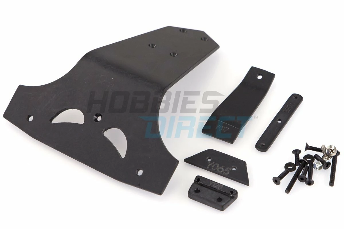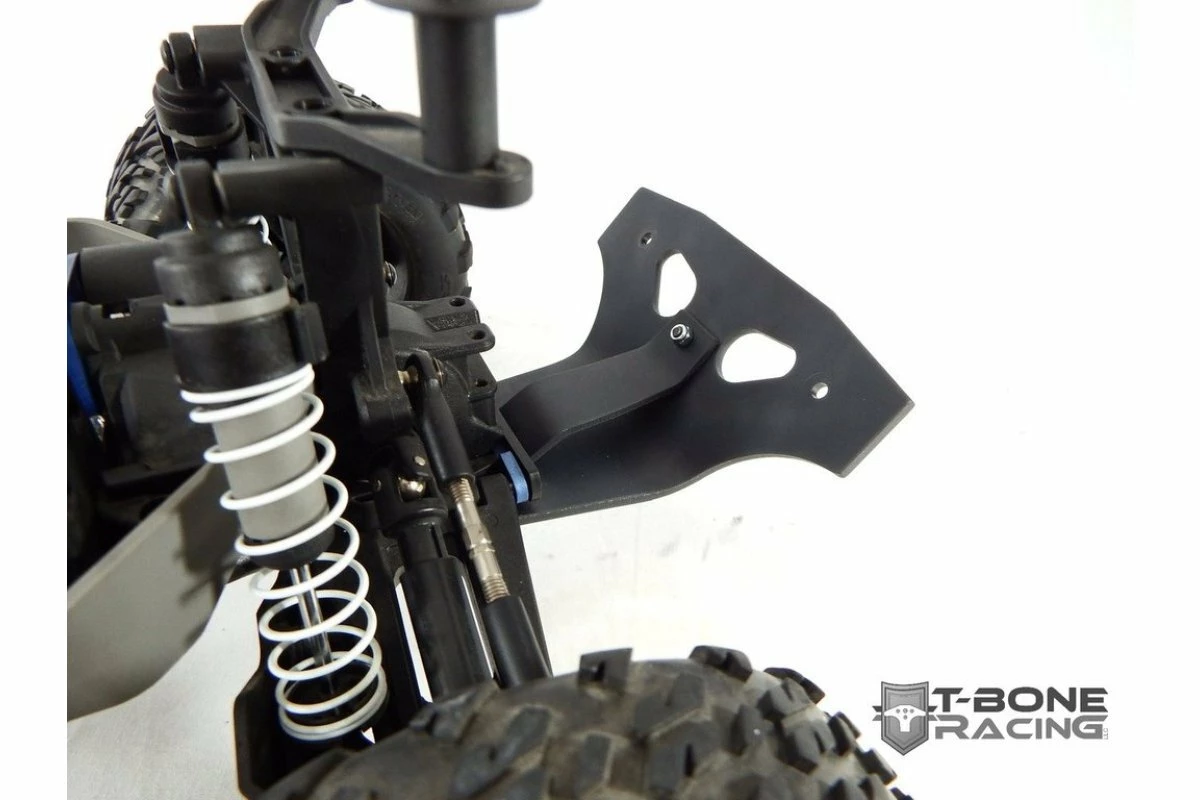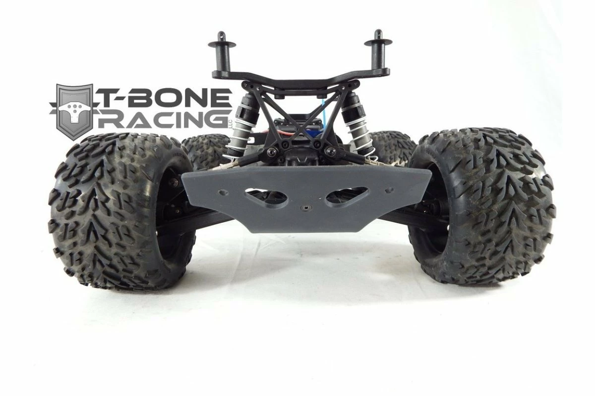 T-Bone Racing NM2 rear bumper for the Stampede 4×4 replaces the stock rear bumper and brace. You can still run the sway bar; however, you will have to modify stock bumper brace.Bumper mounts under the chassis. A Delrin spacer is provided to take up the space left when removing the stock wheelie bar. We also include a Delrin hinge plate to cover the capture pins. The nylon brace is mounted to bumper and floats at the differential.NOTE: This can be used with our 1/10 Monster Truck Wheelie Bar.