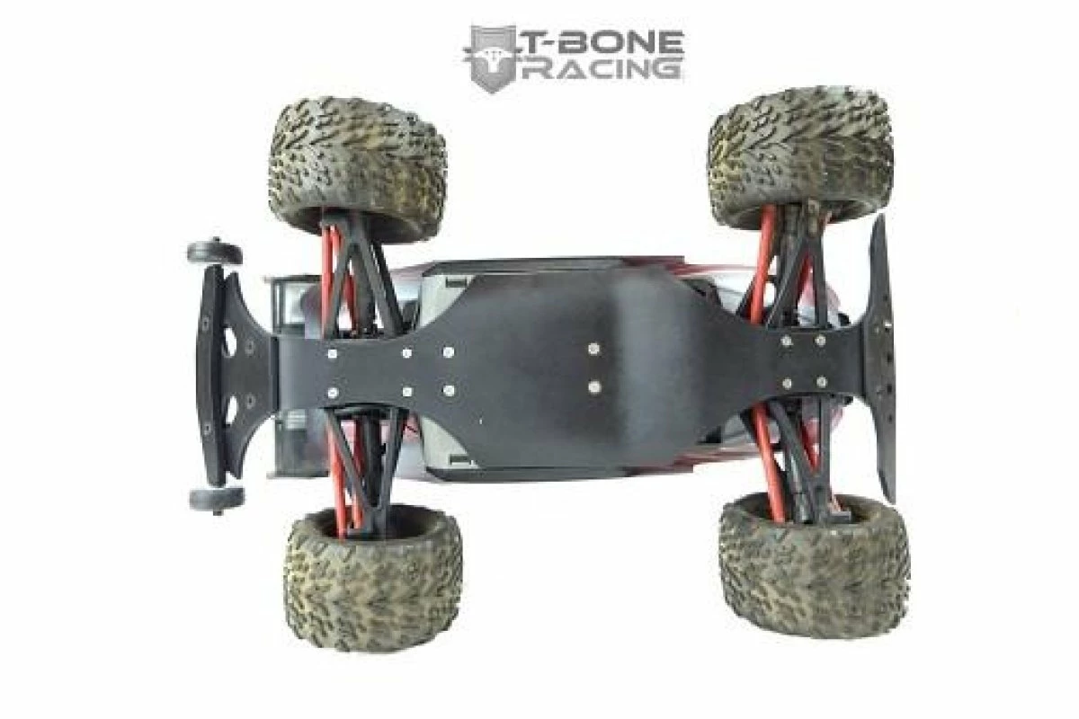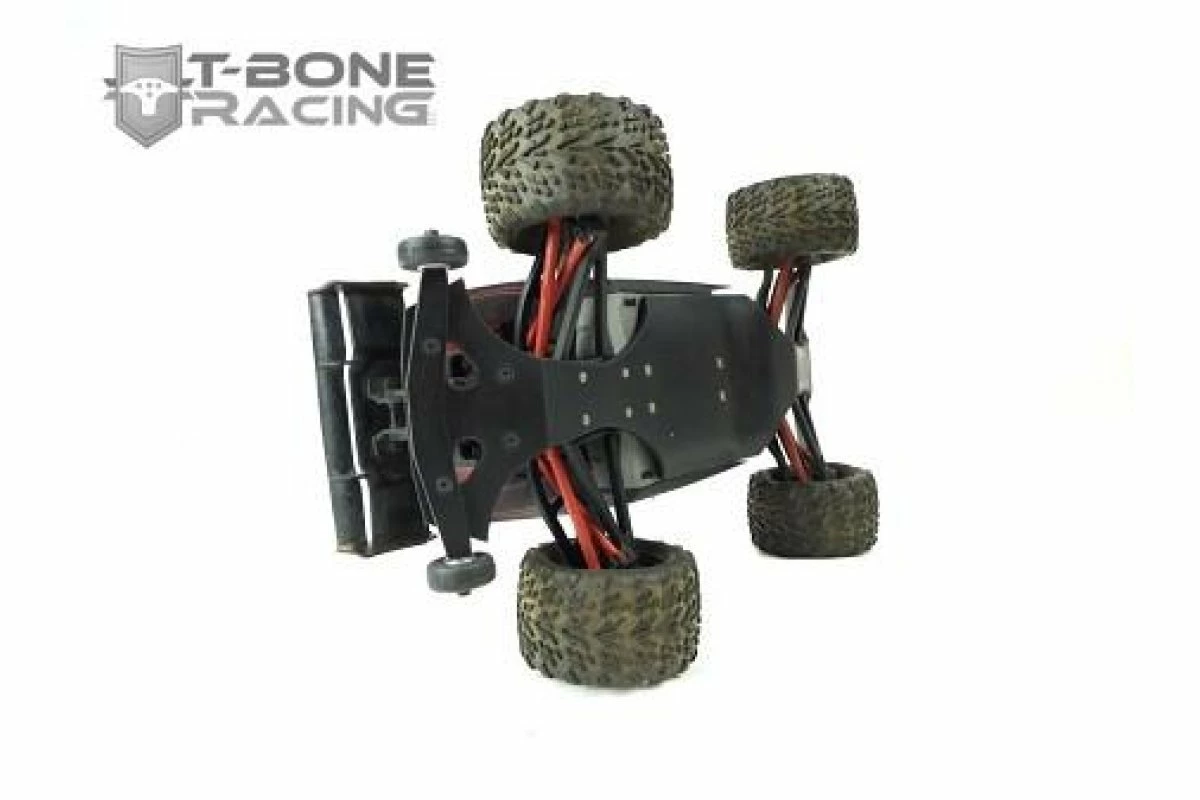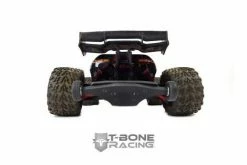 The chassis brace for the 1/16 E-Revo is made of .125″ black nylon and weighs 2.5 oz. It is mounted with 13 screws to spread the impact across the whole length of your chassis. T-Bone Racing use aluminum standoffs to mount between the stock skid/chassis and their brace, providing clearance for the A-Arms. The front and rear bumpers bolt onto the front and rear of the chassis with 2 screws and 2 lock nuts each.You have a choice of three front bolt on bumpers at check. Default is a Thrasher.T-Bone use Phillips head screws as the socket heads strip out too easily.The 1/16 Wheelie Bar comes with rubber tires and aluminum wheels. It bolts onto the rear bumper with 2 screws and 2 lock nuts.