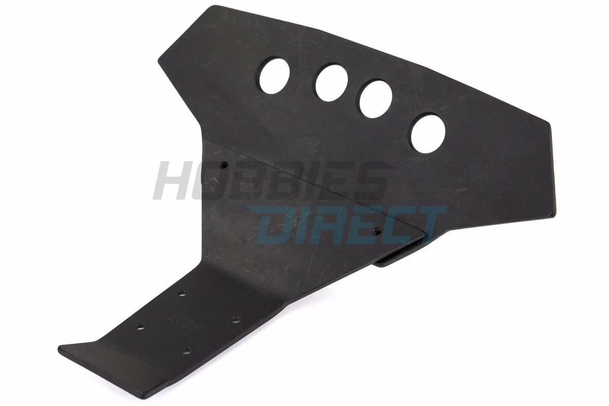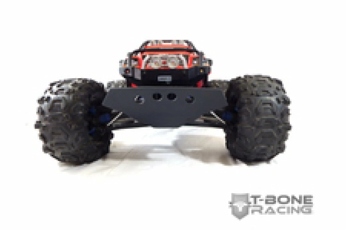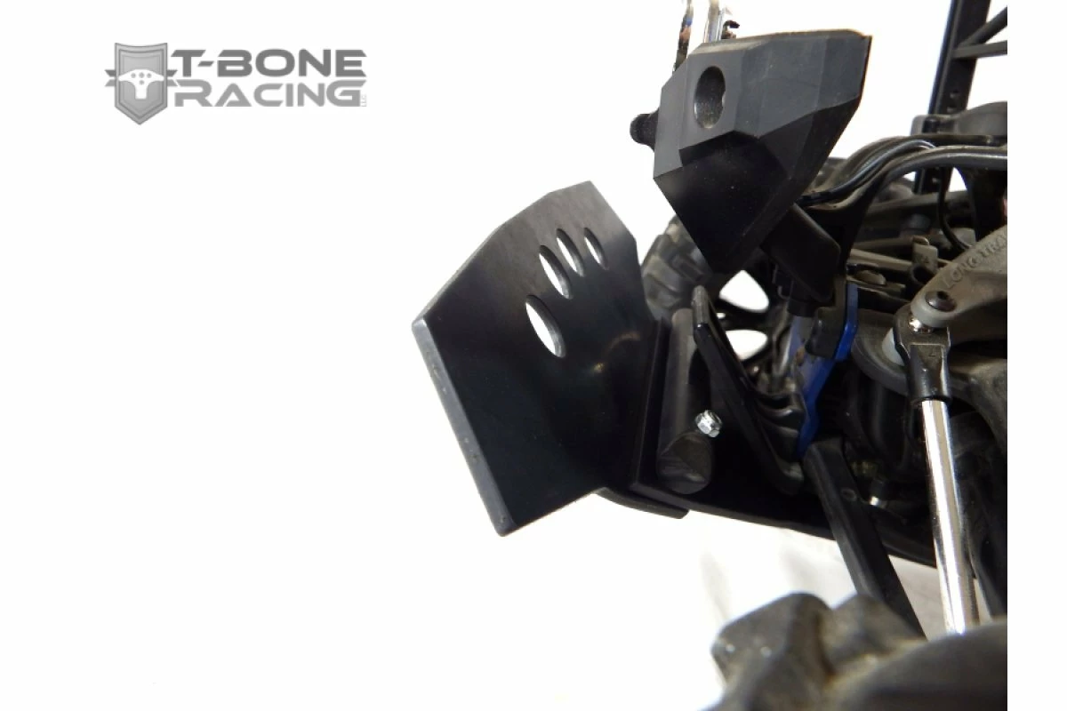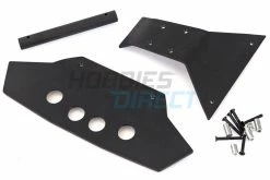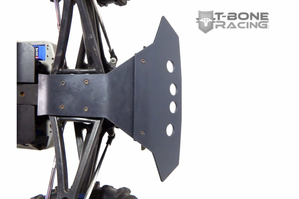 T-Bone Racing Basher front bumper for the 1/10 Summit consists of three pieces. The front bumper skid FBS mounts to the chassis with four aluminum spacers and longer screws. The Basher bumper mounts to the FBS with two screws. A Delrin rod is also mounted at the bumper/ FBS screws and acts as a stiffener.